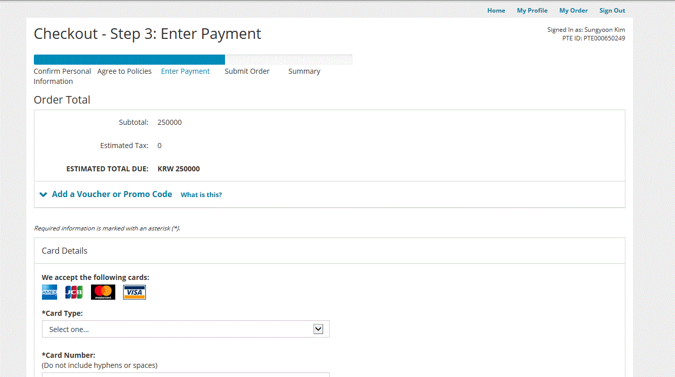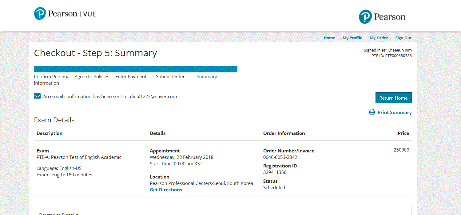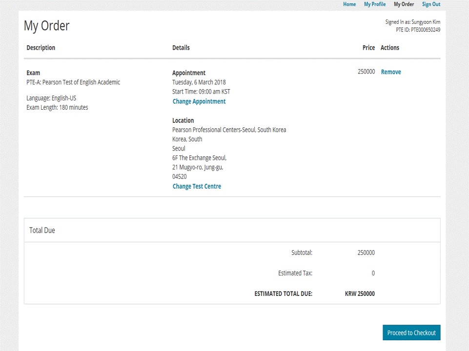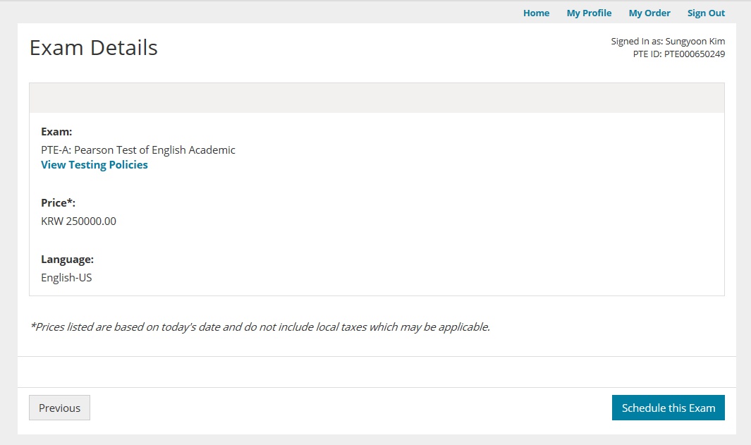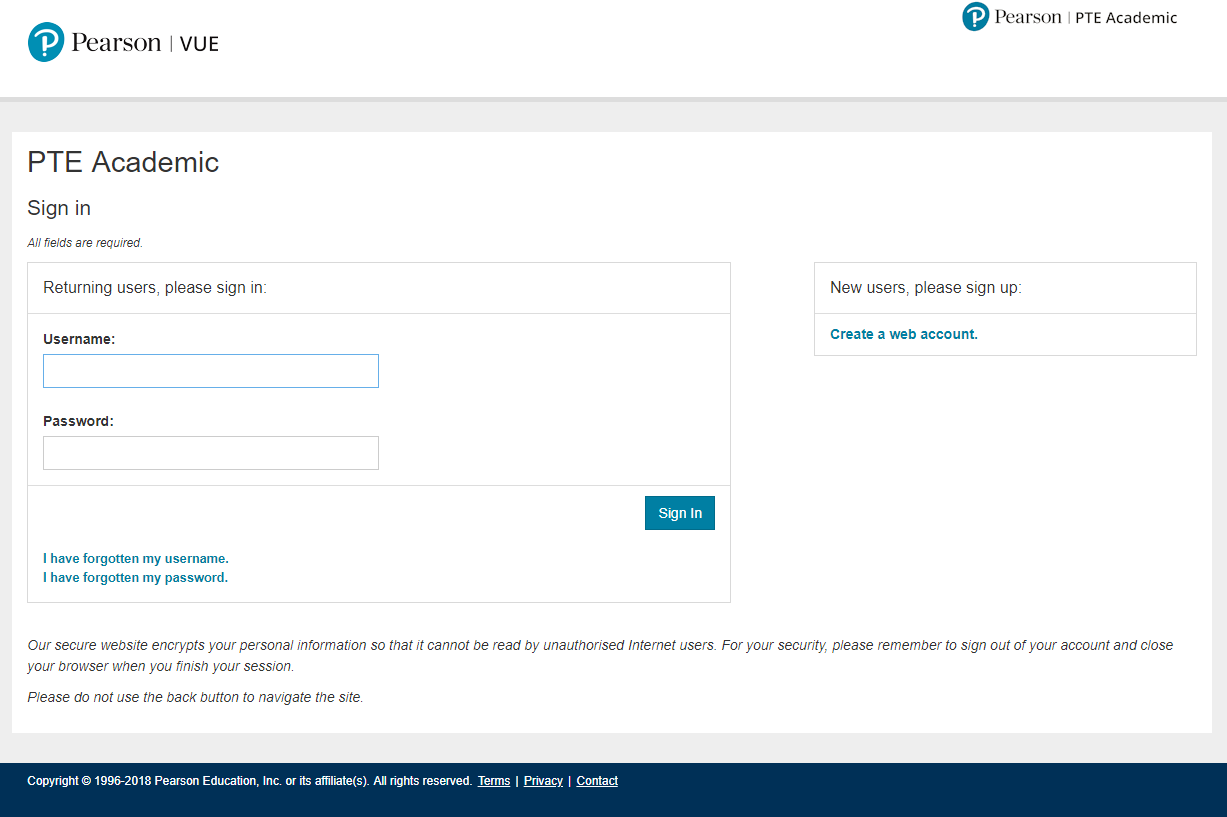 www.pearsonpte.com의 개인 정보 보호 정책 동의 여부 체크