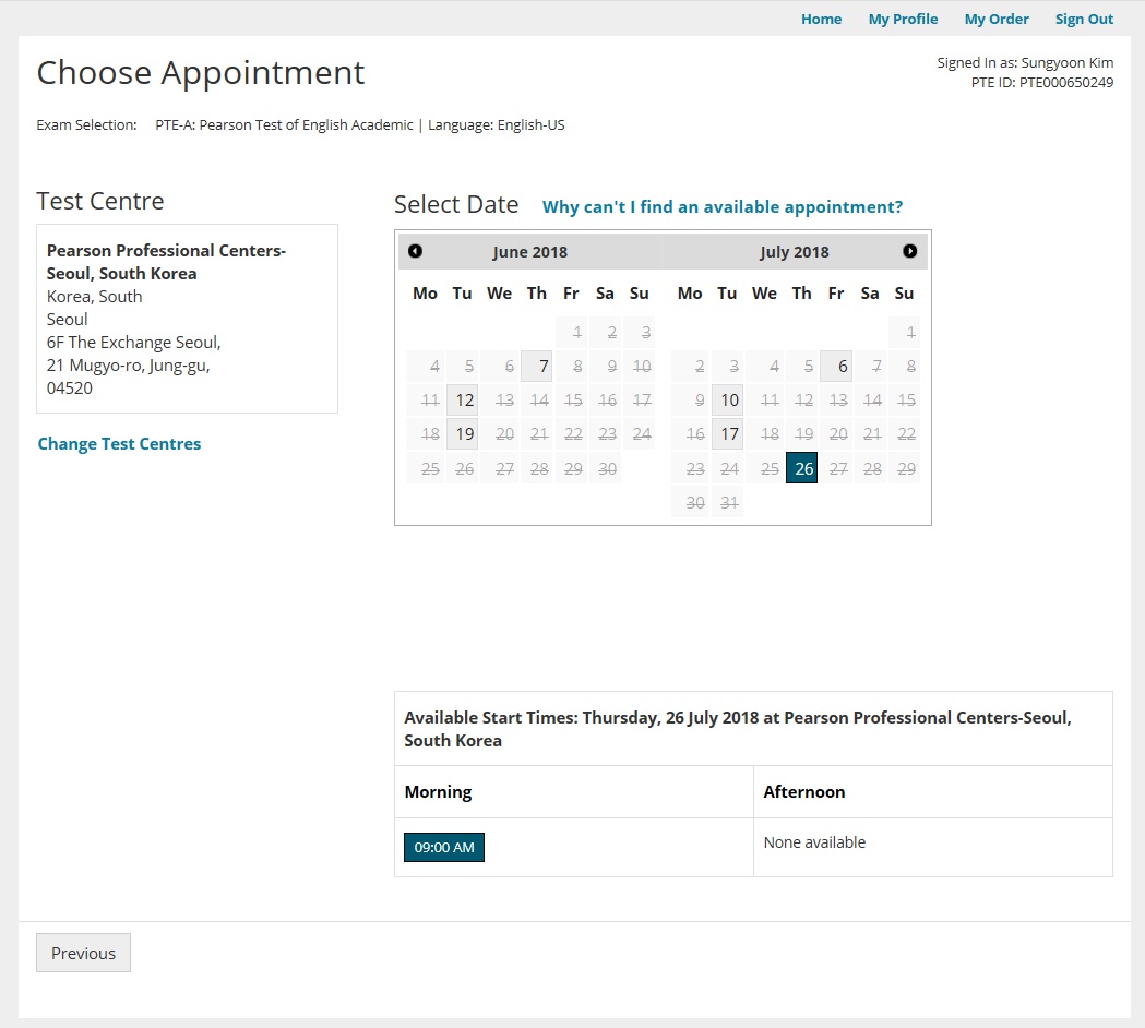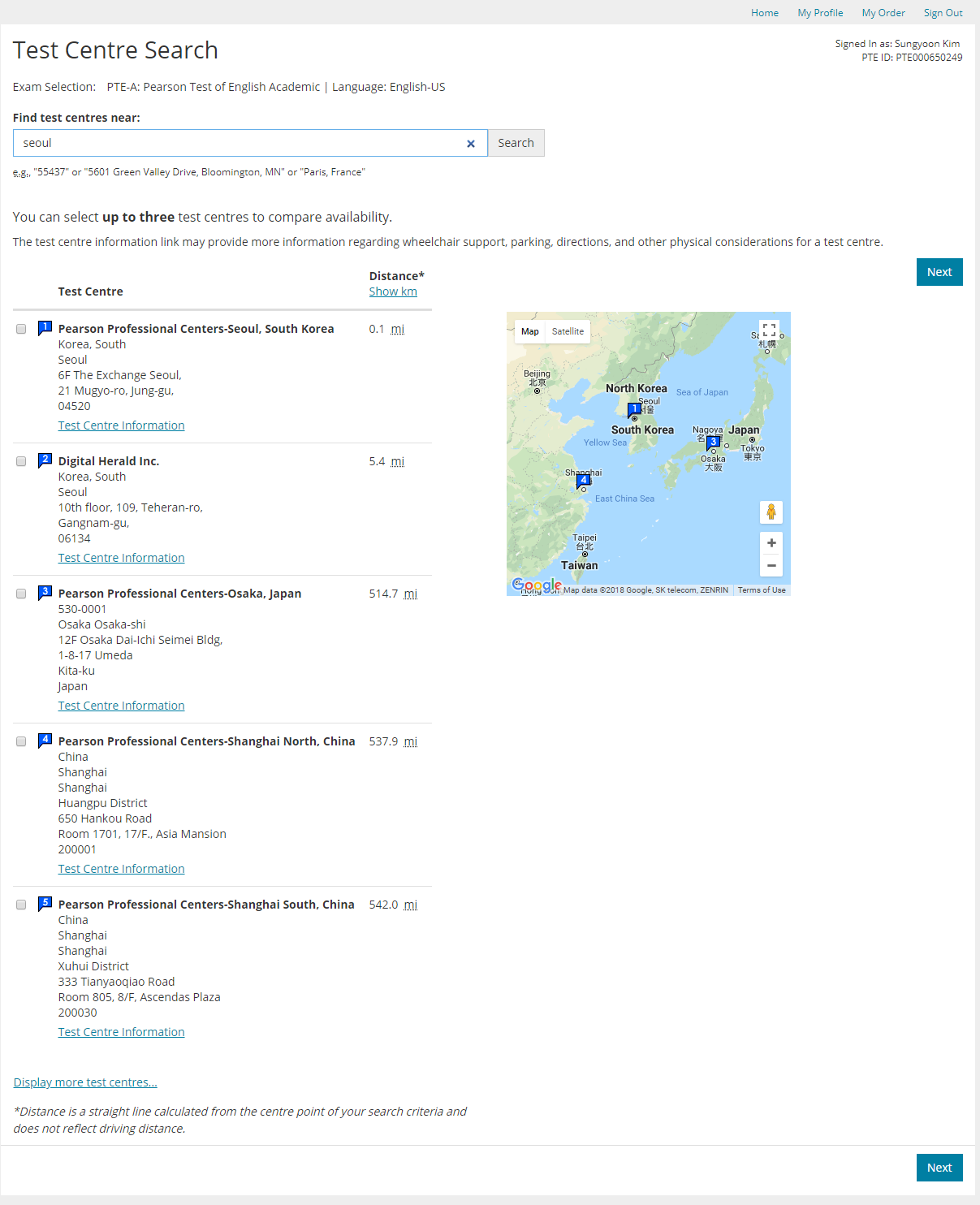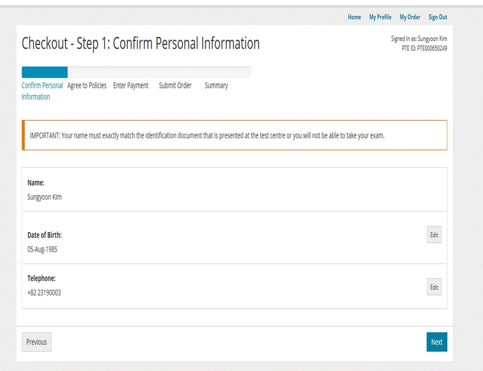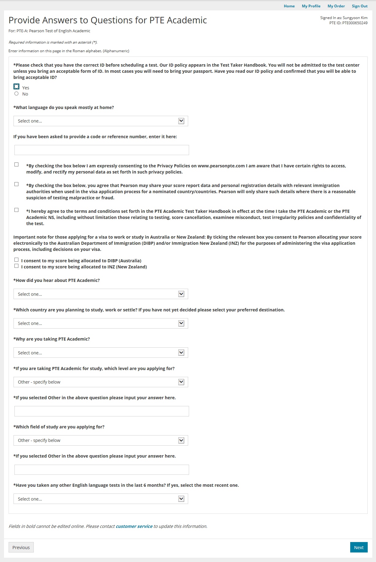 pearson이 지정한 국가에 대한 비자 신청시 출입국 당국에 시험 결과와 개인정보를 공유하며 이에 대한 동의 여부 체크