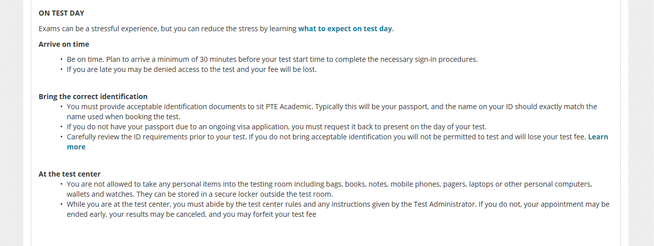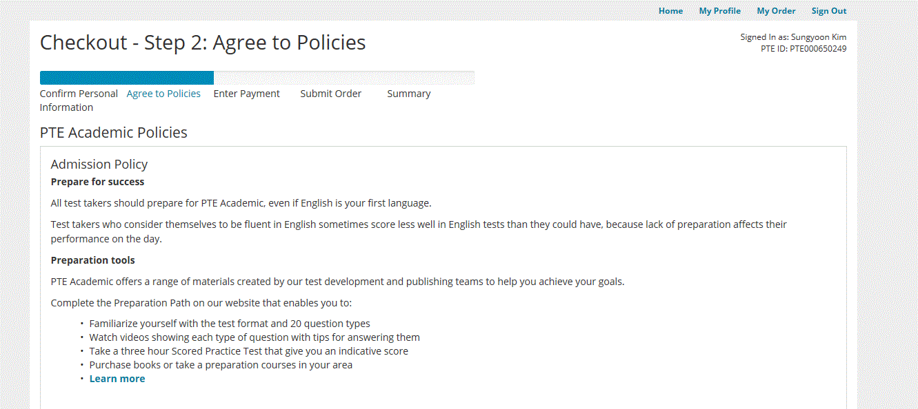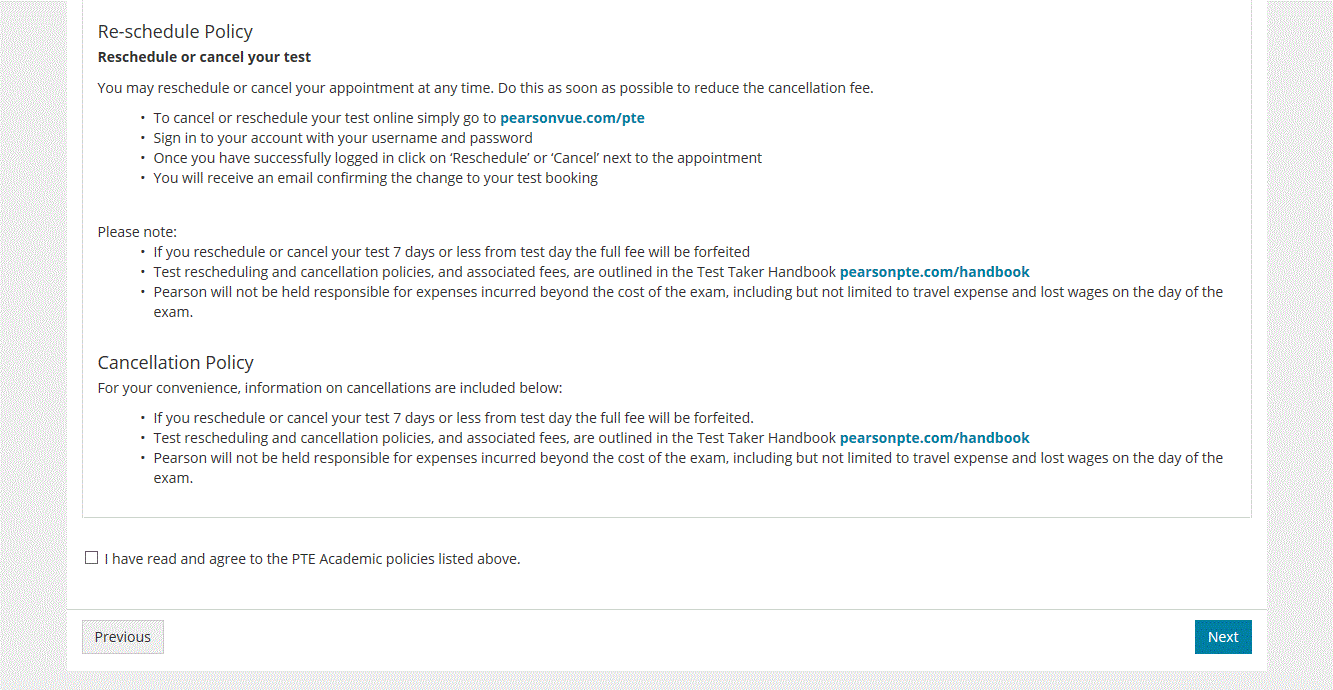 PTE Academic 가이드북에 명시된 시험 규정에 대한 동의 여부 체크