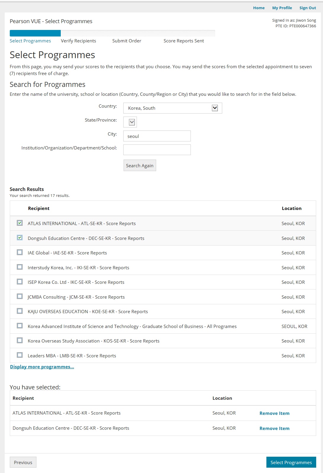 "Search Results" 의 검색 결과에서 전송할 곳들을 선택 후 하단 오른쪽 "Select Programmes" 버튼을 클릭하세요.
